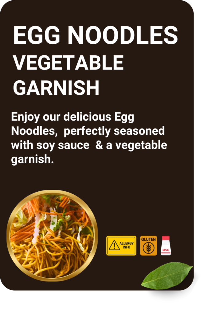 Enjoy our delicious Egg Noodles, perfectly seasoned with soy sauce & a vegetable garnish.
