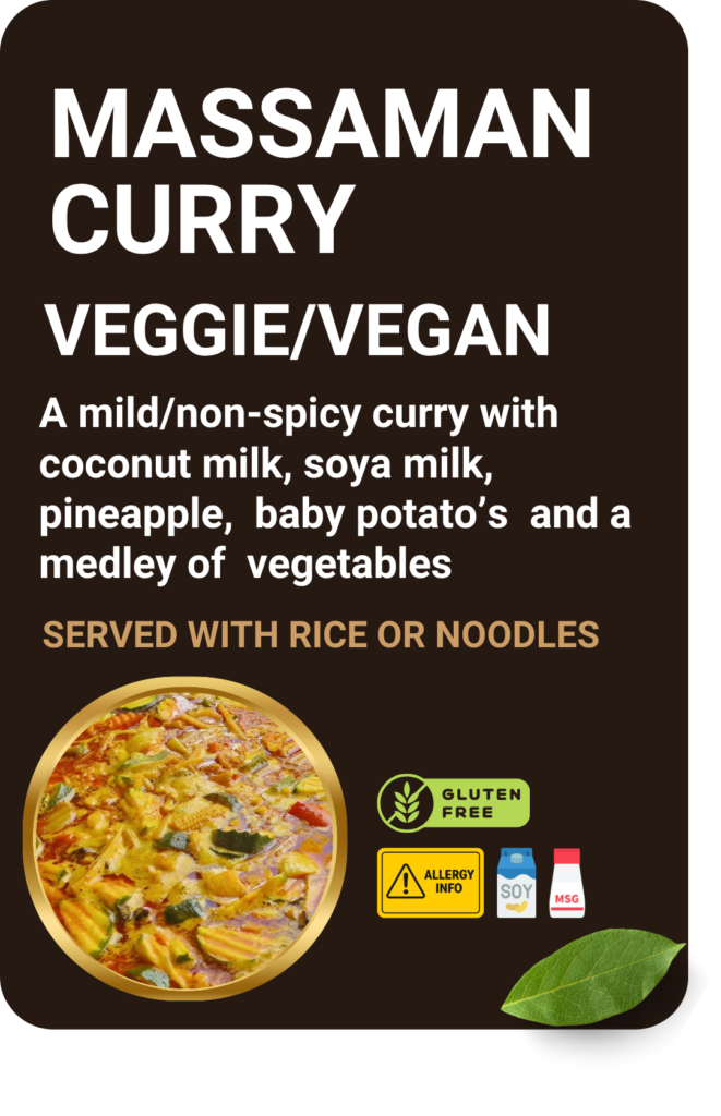 A mild/non-spicy curry with coconut milk, soya milk, pineapple, baby potato’s and a medley of vegetables