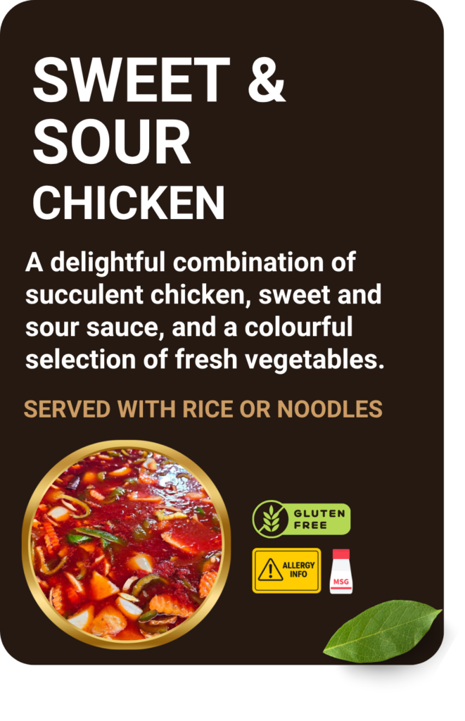 Sweet & Sour – Chicken: A delightful combination of succulent chicken, sweet and sour sauce, and a colourful selection of fresh vegetables.
