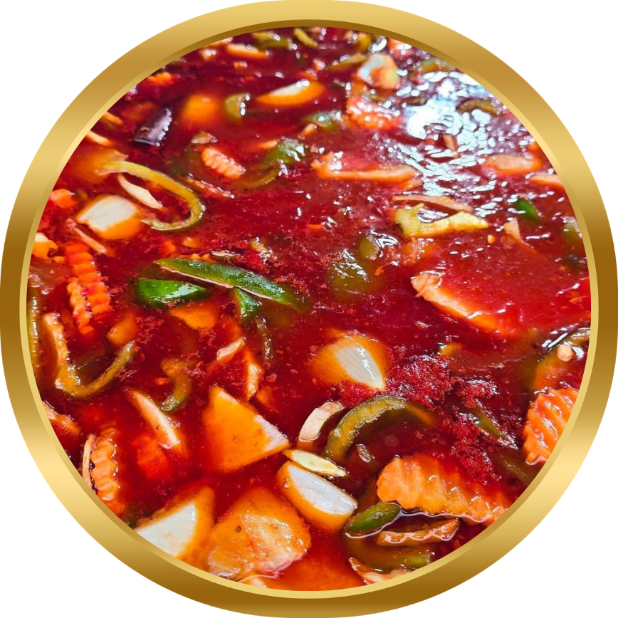 A delightful combination of succulent chicken, sweet and sour sauce, and a colourful selection of fresh vegetables.